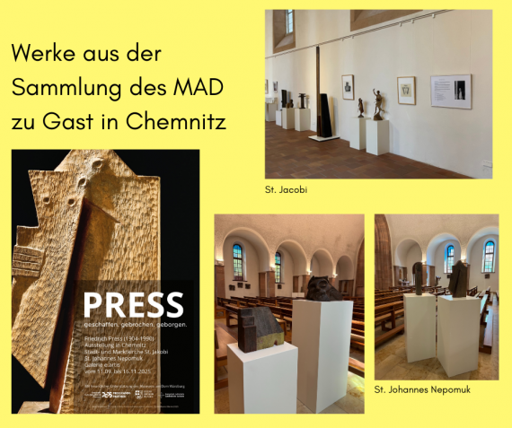 Chemnitz ist Kulturhauptstadt Europas 2025. Das ist Anlass für eine Ausstellung zu Friedrich Press. An mehreren Ausstellungsorten sind Werke des deutschen Künstlers (1904-1990), der lange Zeit in Dresden lebte und wirkte, zu sehen. Der Großteil der dort gezeigten Werke sind Leihgaben aus unserem Sammlungsbestand, den wir - bis auf wenige Ausnahmen - großzügigen Schenkungen der Familie Press verdanken. Es ist die größte Sammlung von Werken des Bildhauers und Zeichners, der auch viele Kirchenräume modern gestaltete. Noch bis zum 16. November 2025 läuft die Ausstellung in St. Jakobi, St. Johannes Nepomuk und der Galerie e.artis.