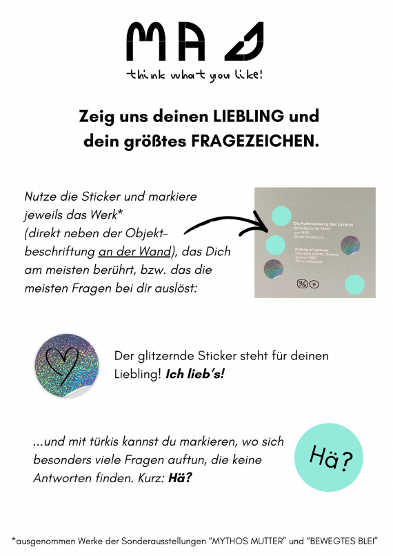 Alle Besucher*innen des MAD sind eingeladen, mit Stickern neben den Hinweistexten ihren LIEBLING bzw. ihr größtes FRAGEZEICHEN kenntlich zu machen. So entsteht spielerisch ein Stimmungsbild... Komm vorbei uns mach mit! Und lass Dich überraschen, was deine Vorgänger*innen zum Staunen gebracht oder ratlos gemacht hat...