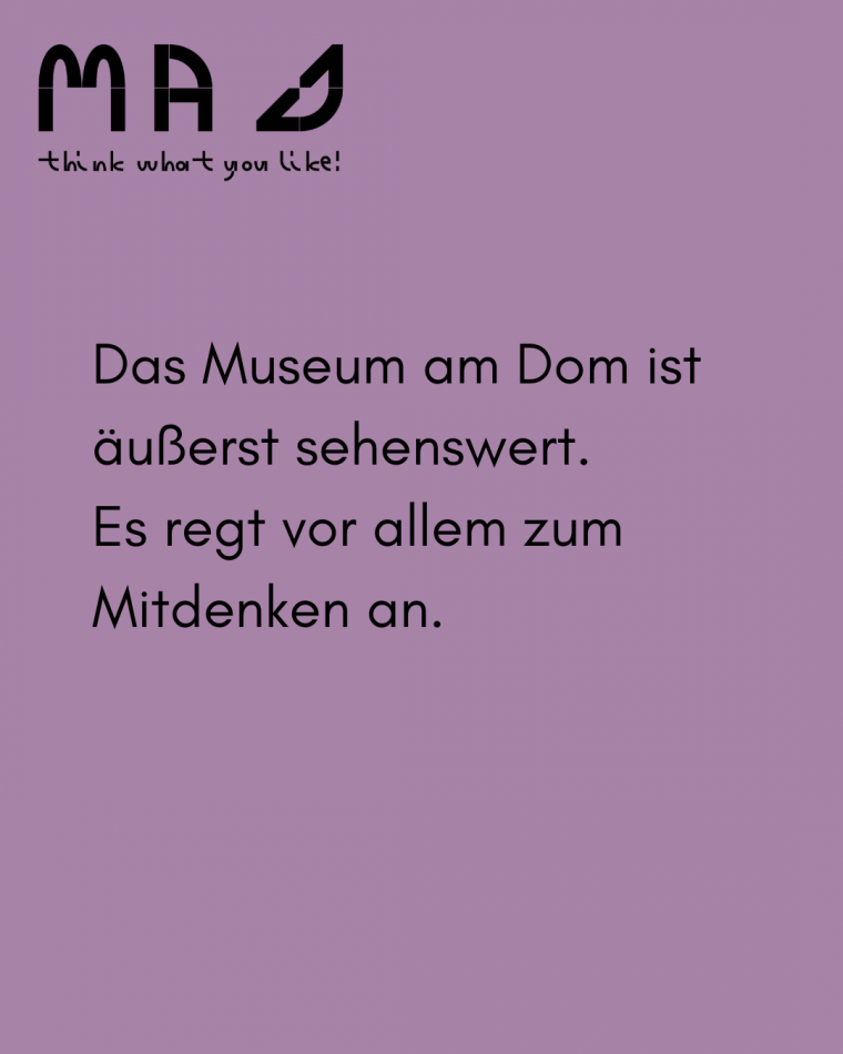 zusätzlich freier Eintritt für: ICOM, Mitglieder Bundesverband Museumspädagogik e. V., Mitglieder des Deutschen Museumsbundes, Freunde des Museums am Dom, FSJ - Freiwilliges Soziales Jahr, BFD - Bundesfreiwilligendienst, Pressevertreter*innen